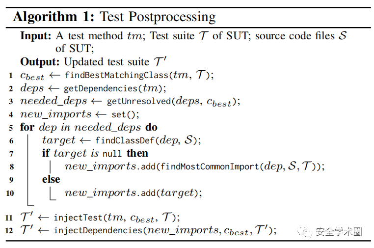 算法1中的第2行到第10行描述了LIBRO的依赖关系解析过程。首先,LIBRO解析生成的测试方法,识别变量类型和引用的类名/构造函数/异常,然后过滤“已经导入”的类名,方法是将名称与测试类中现有的导入语句进行词汇匹配(第3行)。