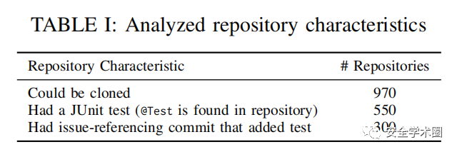 为了进一步验证开发人员定期处理report-to-test问题,作者通过挖掘数百个开源Java存储库,分析了可归因于错误报告的测试增加的数量。他们从Alon等人[8]的Java-med数据集(它由GitHub的1000个顶级Java项目组成)开始。从每个存储库的提交列表中,检查(1)提交是否添加了一个测试,以及(2)提交是否链接到一个issue。为了确定一个提交是否添加了一个测试,作者检查它的diff是否添加了@Test装饰符和一个测试体。此外,如果(1)提交消息提到了”(fixes/resolves/closes) #NUM”,或者(2)提交消息提到了一个pull请求,这又提到了一个issue,就将提交链接到一个bug报告(或者GitHub中的一个issue)。将此类报告相关提交所增加的测试数量与当前(2022年8月)测试套件的规模进行比较,以估计此类测试的流行程度。由于不同的存储库有不同的issue处理实践,因此过滤掉没有添加测试的问题相关提交的存储库,因为这表明不同的issue处理实践(例如google/guava)。作者分析了300个存储库,如表1所示。作者发现,相对于当前的测试套件大小,这300个存储库中通过发布引用提交添加的测试的中值比率为28.4%,这表明大量测试是由于错误报告而添加的。但这并不意味着测试套件中28.4%的测试来自错误报告,因为作者没有跟踪添加测试后测试的情况。尽管如此,它表明测试活动报告在测试套件的发展中发挥着重要作用。基于这一结果,作者得出结论:报告report-to-test的生成问题是由开源开发人员定期处理的。