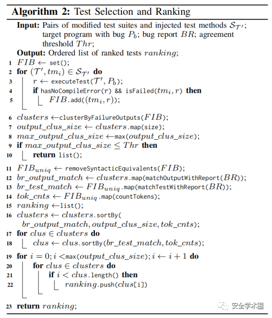 由于具有相同失败输出的测试彼此相似,所以作者认为:如果来自一个集群的一个测试不是BRT,来自同一个集群的其余测试很可能也不是BRT。因此,LIBRO展示了来自不同集群的测试。对于第19-22行的每个第