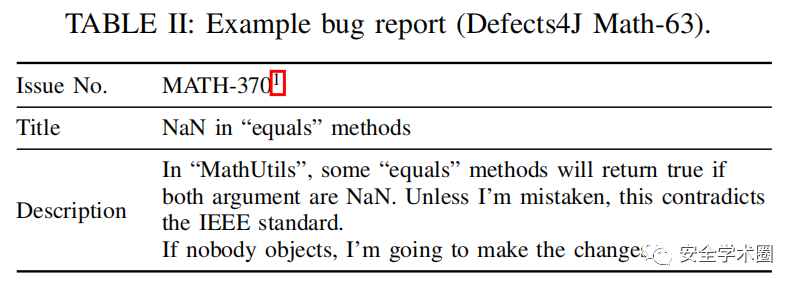 现有的工作试图通过关注不同的方面来解决问题的特殊情况:一些研究者将报告的句子分为观察到的或预期的行为等类别[9],而另一些研究者只复现崩溃(崩溃再现)[10],[11]。解决这个问题需要对自然语言和编程语言都有很好的理解,还需要执行推理的能力。例如,表2中的bug报告没有明确指定任何代码,但是精通英语和Java的开发者能够推断出当两个参数都是NaN时,“MathUtils”中的“equals”方法应该返回false。