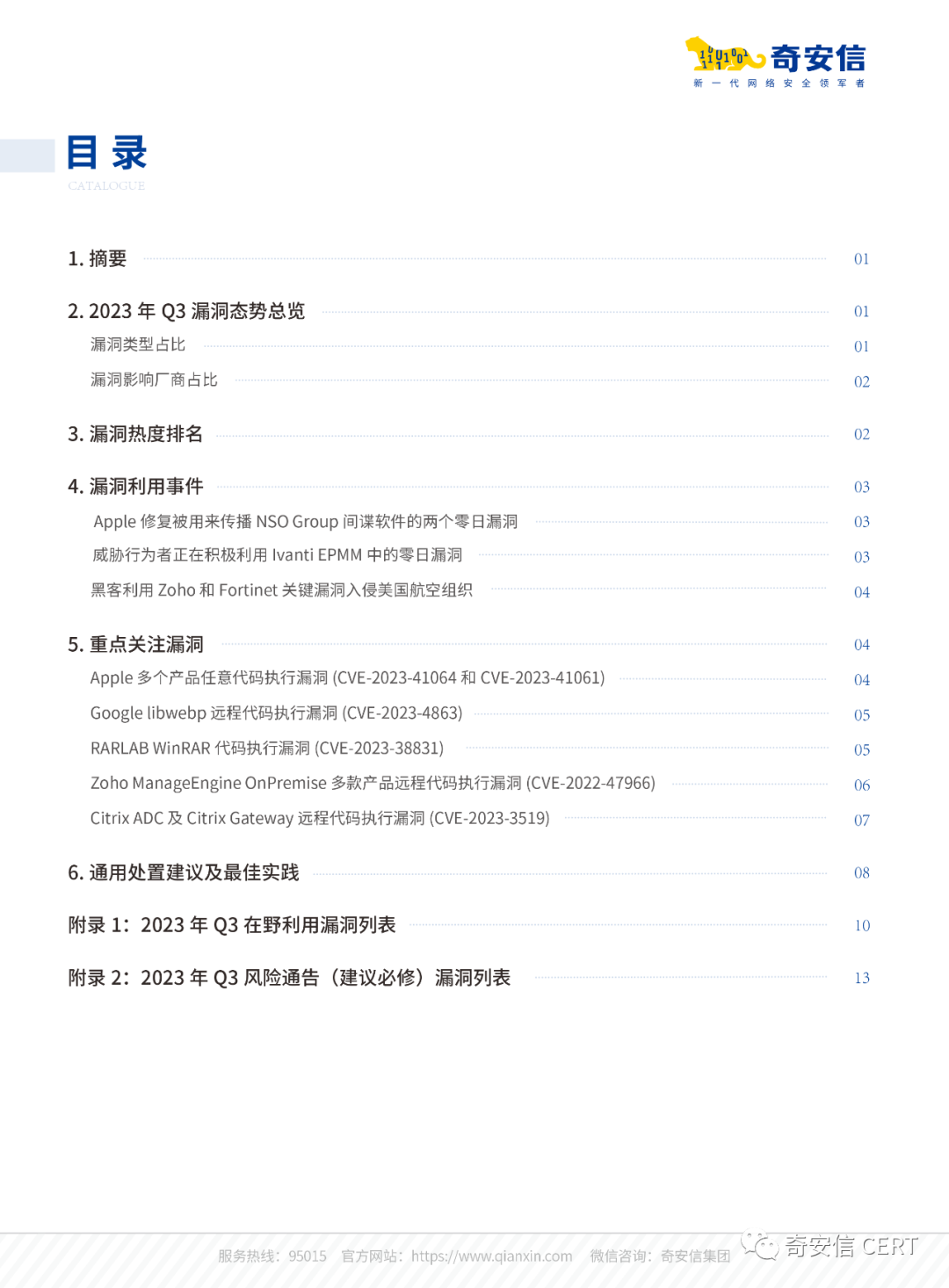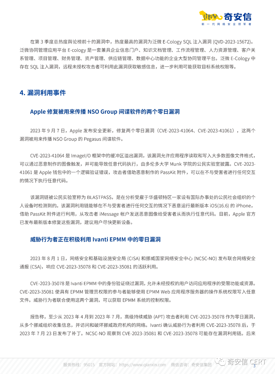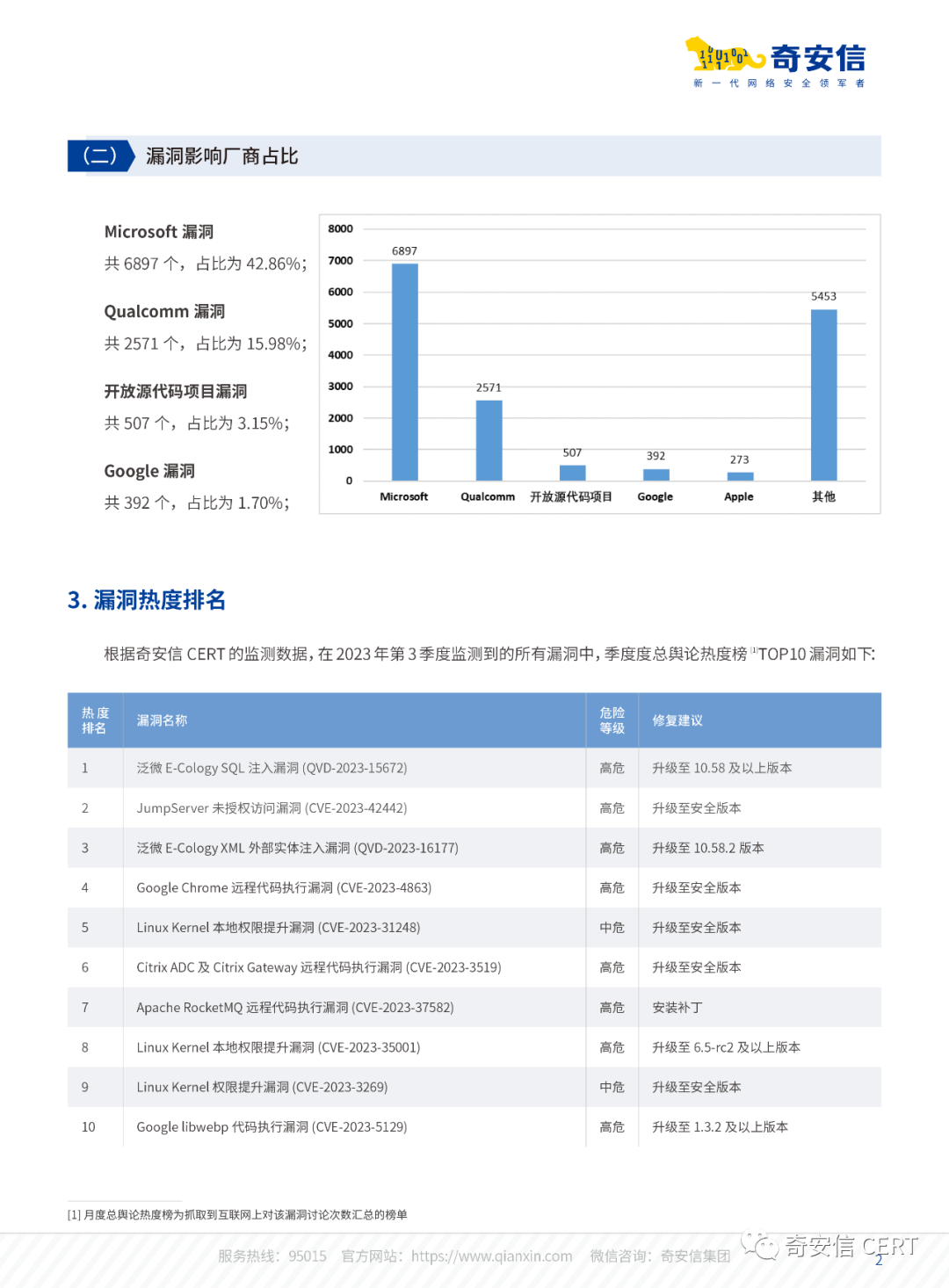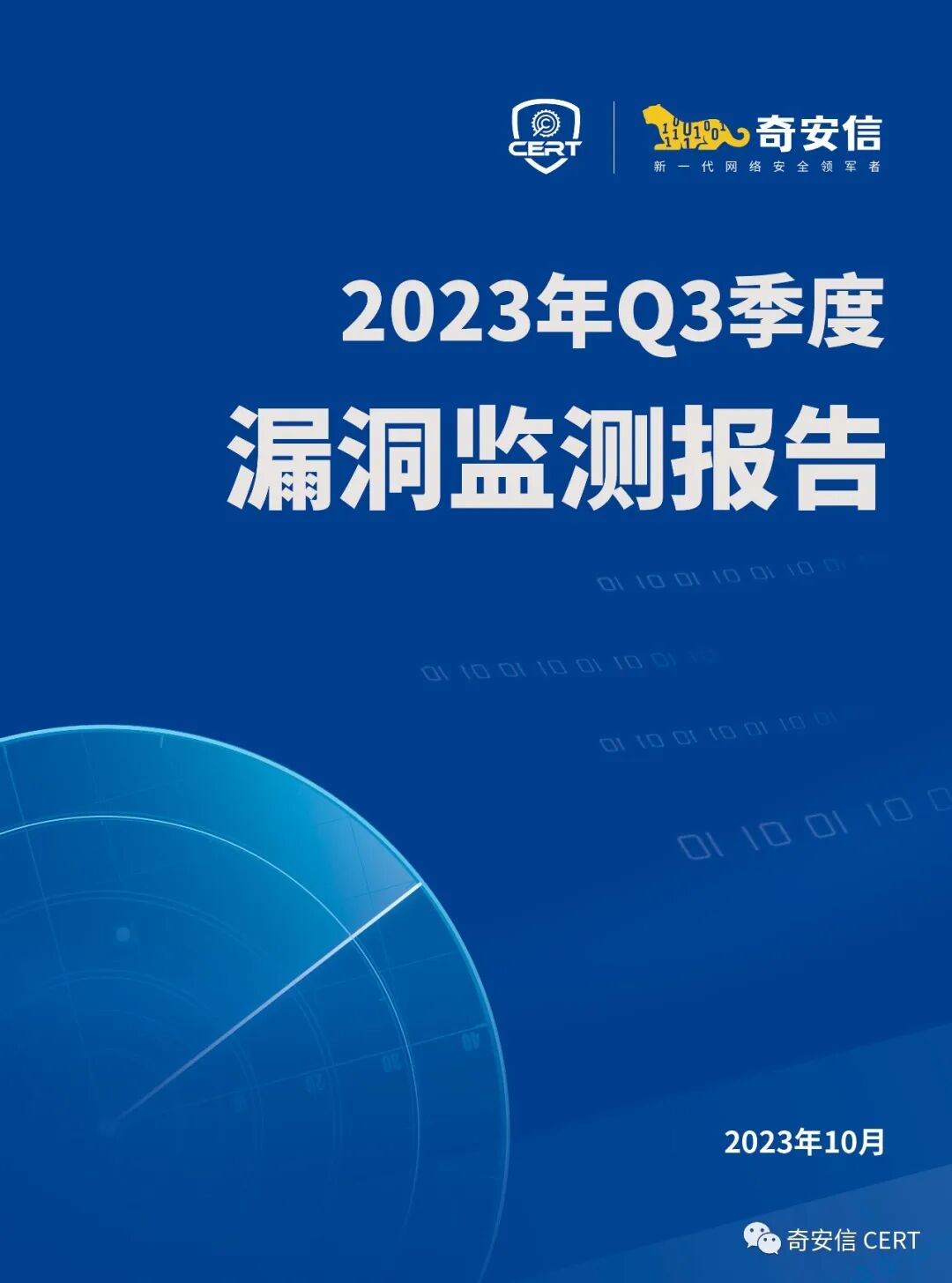 • 根据奇安信CERT监测,QVD-2023-15672、CVE-2023-42442和QVD-2023-16177是本季度被提及最多的3个漏洞。