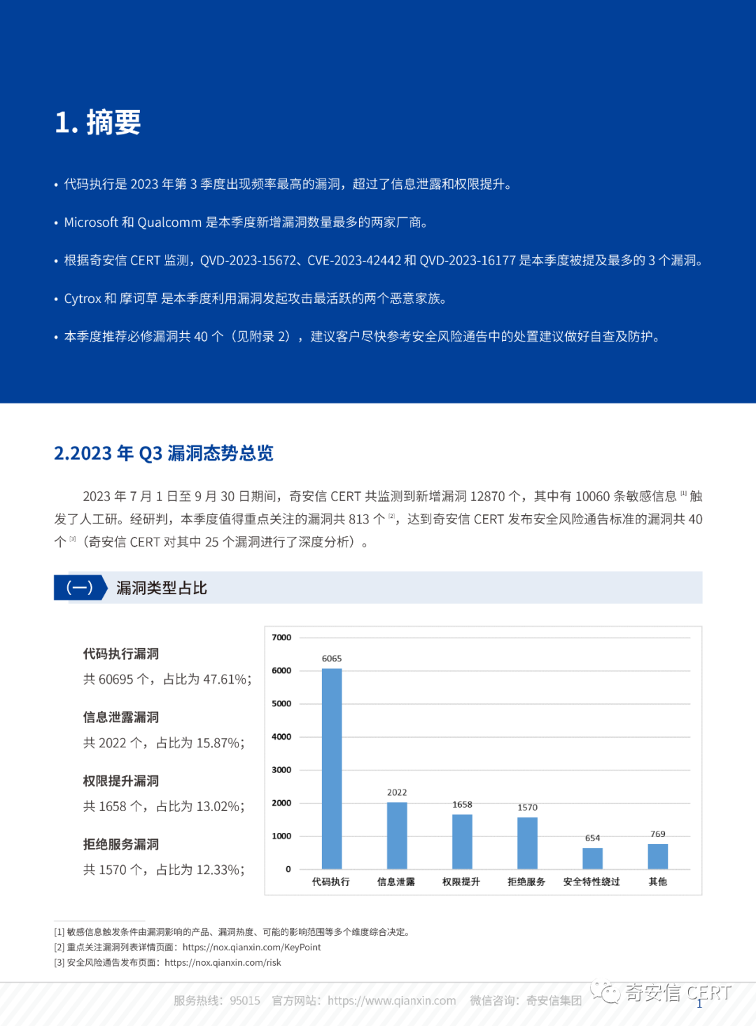 2023年7月1日至9月30日期间,奇安信CERT共监测到新增漏洞12870个,其中有10060条敏感信息触发了人工研判 。经研判,本季度值得重点关注的漏洞共813个,达到奇安信CERT发布安全风险通告标准的漏洞共40个(奇安信CERT对其中25个漏洞进行深度分析)。