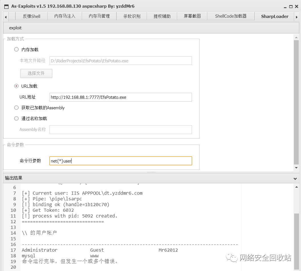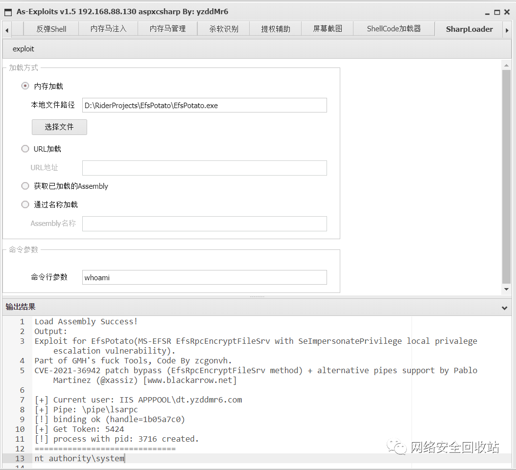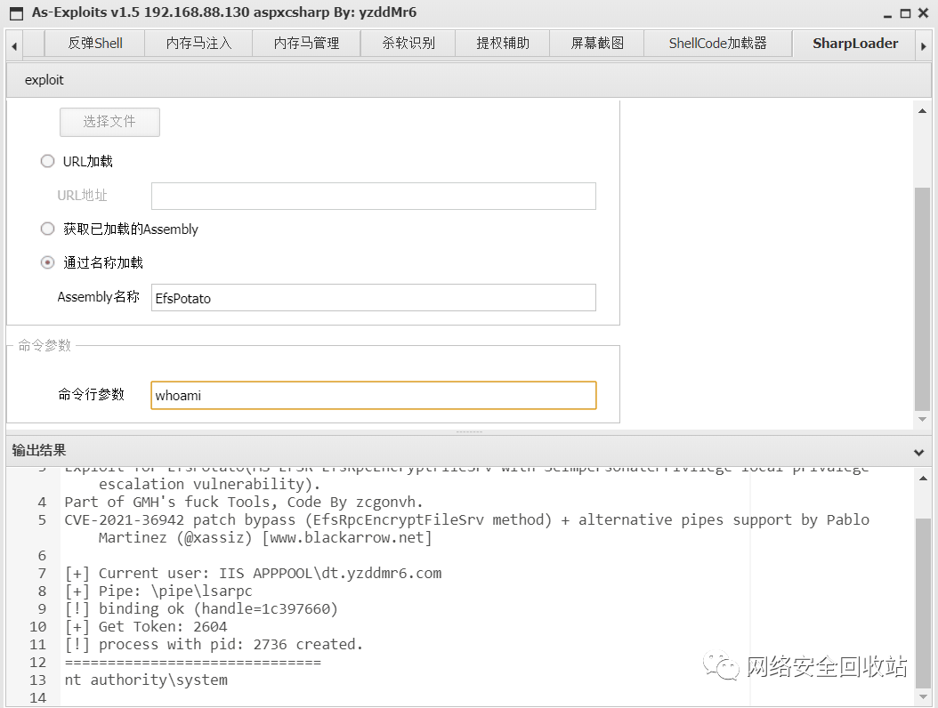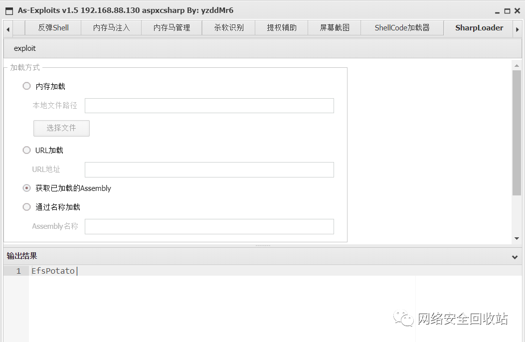 aspxcsharp新增SharpLoader模块,支持内存加载、远程加载Assembly;支持获取已加载过的Assembly,无需重复上传;支持传递命令行参数,自动获取输入输出。