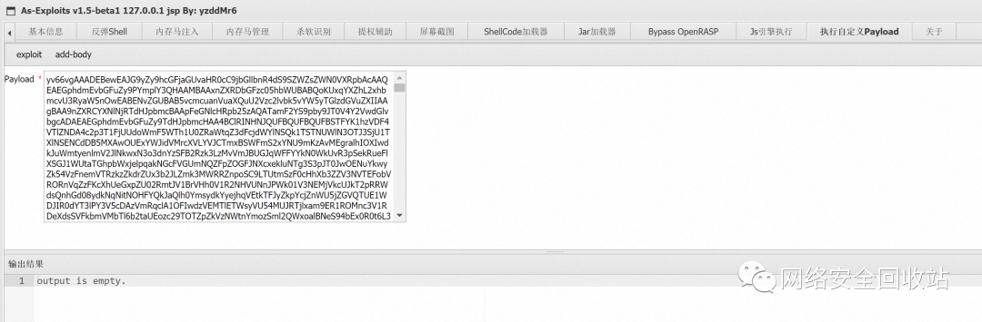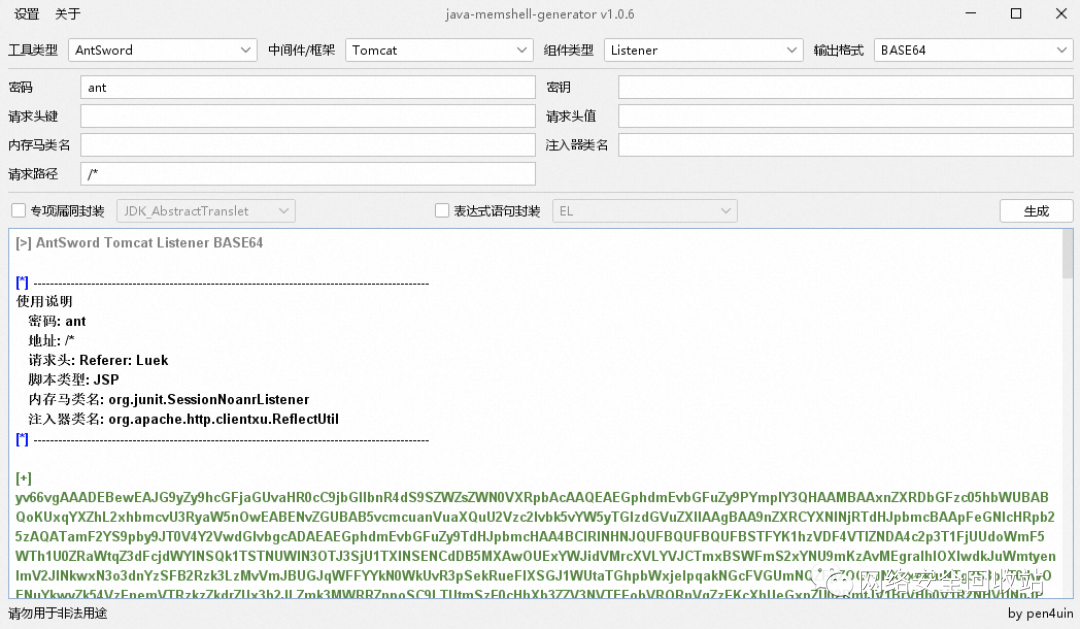 As-Exploits设计理念之一就是要提供良好的扩展性,这里以 执行自定义Payload 功能举例。虽然插件中内置了一些常见的内存马,但是在实际中我们可能想打入一些别的内存马。这里可以借助pen4uin师傅的JMG项目生成一个蚁剑-Listener内存马