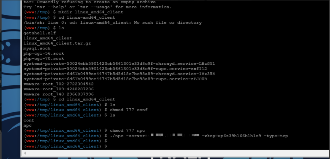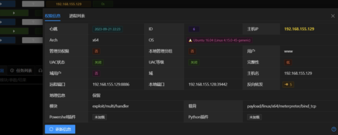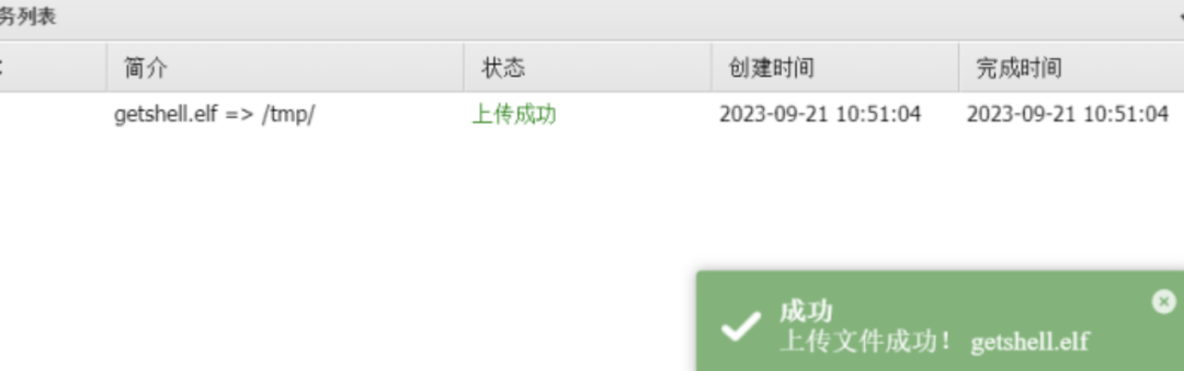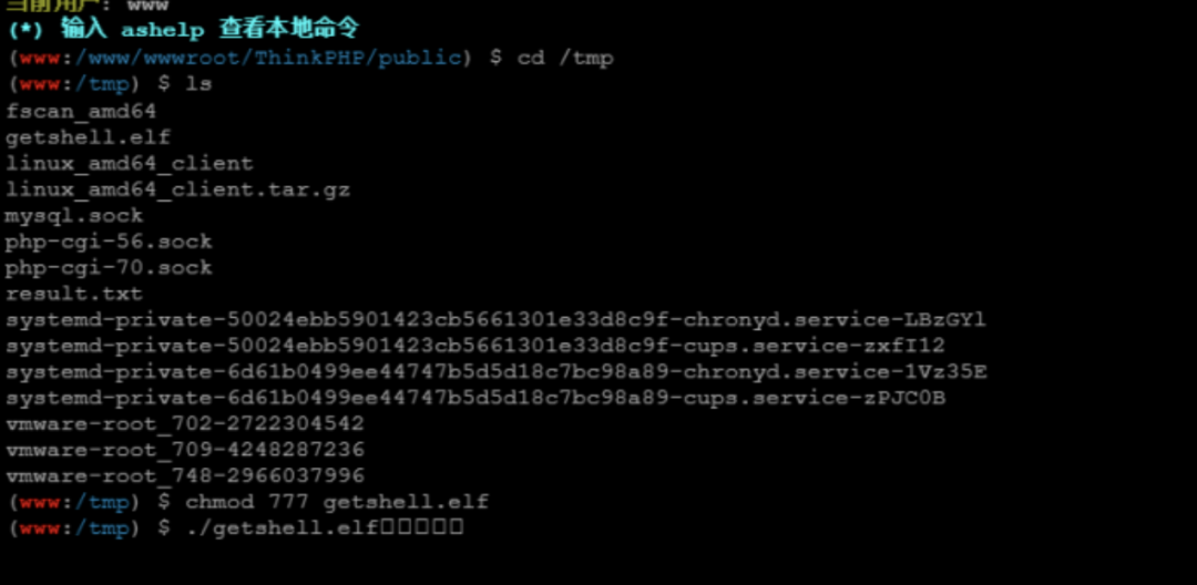 生成elf可执行木马,通过蚁剑上传到/tmp目录下,赋予执行权限: