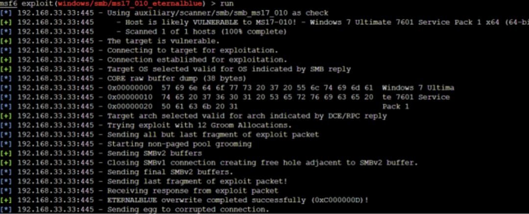 验证一下永恒之蓝漏洞:直接用msf里面的ms17010 exp进行攻击