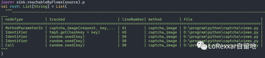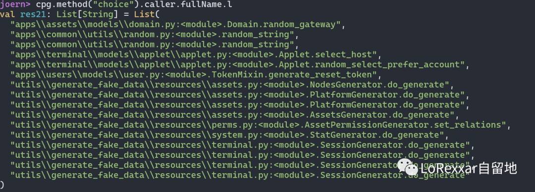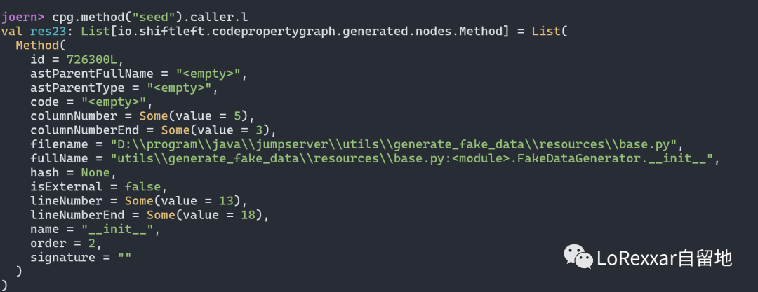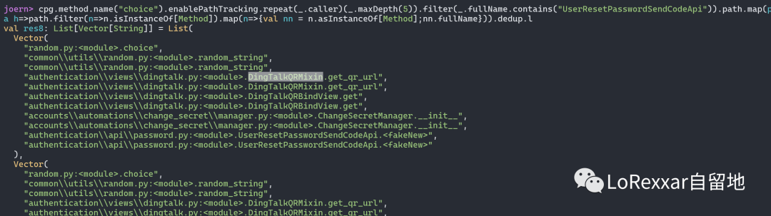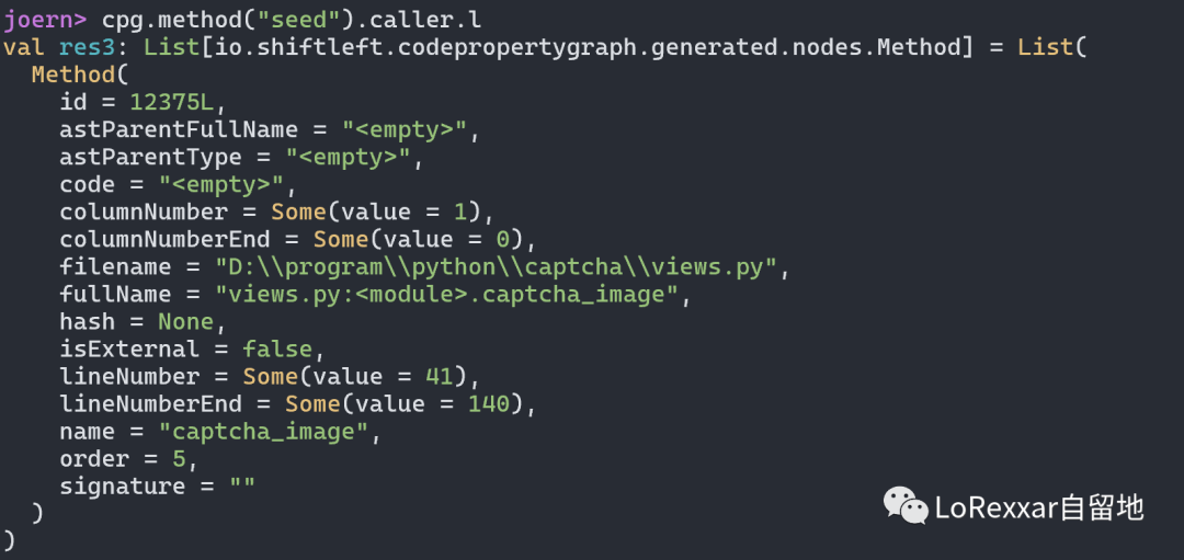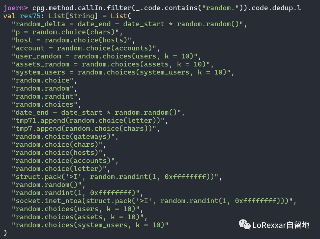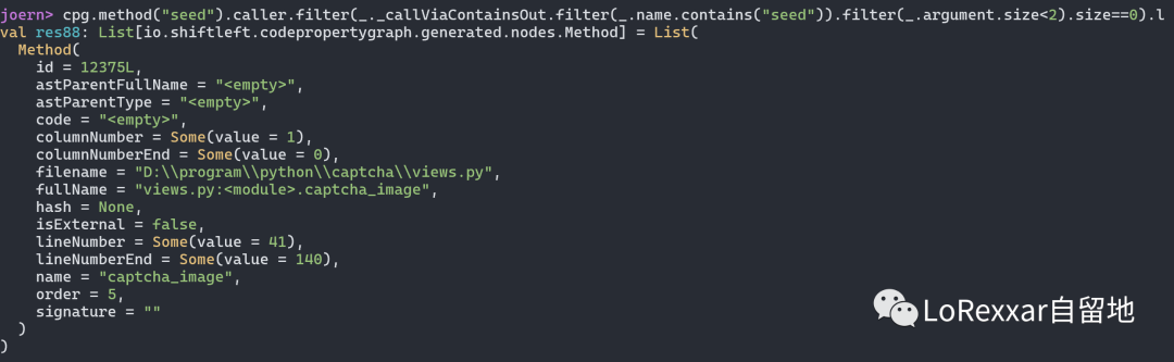 如果返回结果,则证明该方法中没有重置新的随机数种子,当然,到这里并不能完全的验证这个结论,毕竟这里指处理了显式重置,如果是更严格的数据流分析,应该从重置随机数种子的位置入手,确认是否有数据流经过,但这种方案对于joern来说比较困难,这里先不深入到这个级别研究。