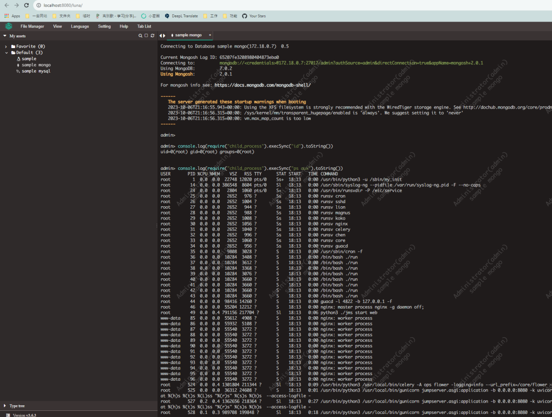 复现方法是,在Jumpserver后台增加MongoDB资产并来到Web Terminal模块连接数据库,即可在交互式命令行中执行JavaScript代码: