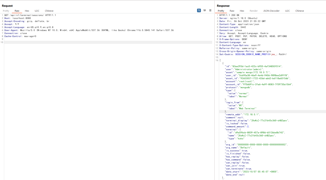 这个视图用于展示所有连接过的session列表。比如,用户不论从SSH还是从Web Terminal访问堡垒机中的服务器,都会建立一个Session,我们可以通过这个接口来访问: