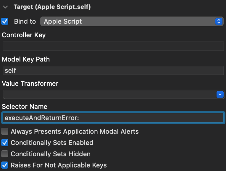 这设置了我们的代码执行gadget,它将根据请求运行AppleScript。为了真正触发AppleScript的执行,我们现在只需添加一个按钮,该按钮将绑定到我们刚刚创建的Apple Script对象,并将调用executeAndReturnError: selector: