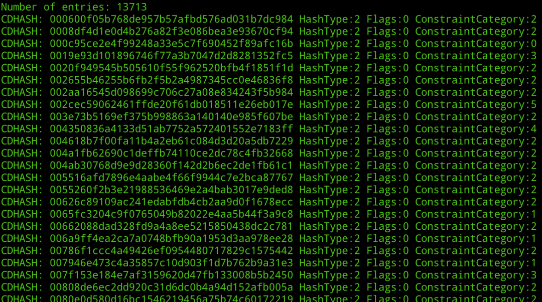 提取缓存后,我们需要解析内容。为此,我们需要创建了一个脚本extract_trustcache.py,具体过程可以在这里找到,它将为我们提供CDHASH和ConstraintCategory列表: