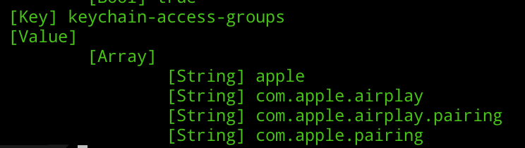 例如,许多应用程序都带有值得探索的 keychain-access-groups。iOS的keychain服务提供了一种安全的保存私密信息(密码,序列号,证书等)的方式,每个ios程序都有一个独立的keychain存储。相对于NSUserDefaults、文件保存等一般方式,keychain保存更为安全,而且keychain里保存的信息不会因App被删除而丢失。钥匙串以储存在文件系统中的 SQLite 数据库的形式实现,而且数据库只有一个,securityd 监控程序决定每个进程或 App 可以访问哪些钥匙串项。钥匙串访问 API 将生成对监控程序的调用,从而查询 App 的“keychain-access-groups”、“application-identifier”和“application-group”权限。访问组允许在 App 之间共享钥匙串项,而非将访问权限限制于单个进程。