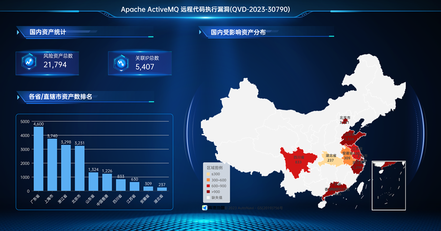 奇安信鹰图资产测绘平台数据显示,Apache ActiveMQ 远程代码执行漏洞(QVD-2023-30790)关联的国内风险资产总数为21794个,关联IP总数为5407个。国内风险资产分布情况如下: