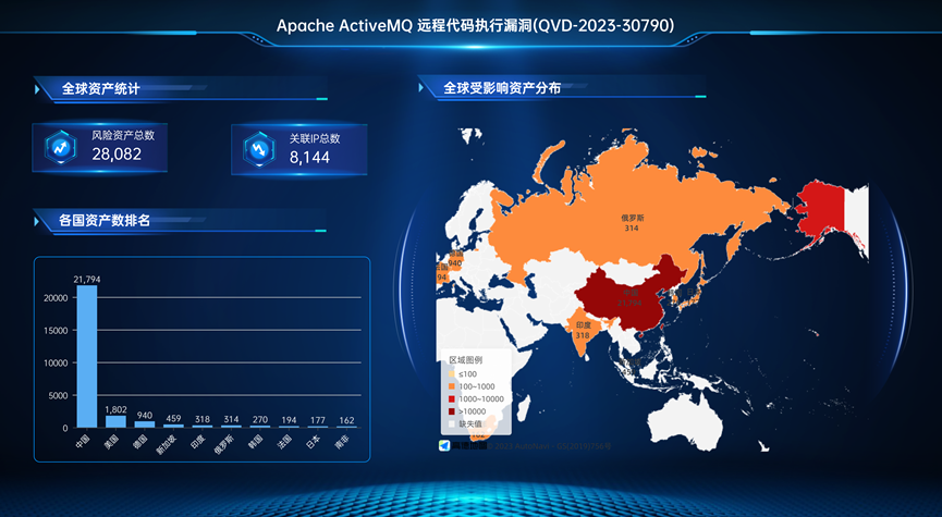 Apache ActiveMQ 远程代码执行漏洞(QVD-2023-30790)关联的全球风险资产总数为28082个,关联IP总数为8144个。全球风险资产分布情况如下: