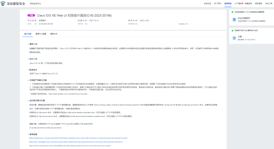 【漏洞通告】Cisco IOS XE Web UI 权限提升漏洞(CVE-2023-20198)