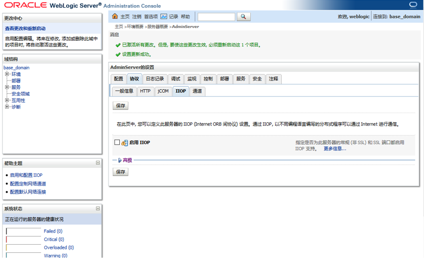 在WebLogic控制台中,选择“服务”->”AdminServer”->”协议”,取消“启用IIOP”的勾选。并重启WebLogic项目,使配置生效。