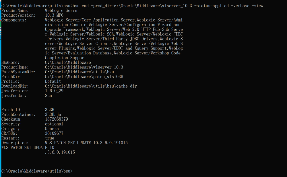 bsu.cmd -install -patch_download_dir=C:\Oracle\Middleware\utils\bsu\cache_dir -patchlist=3L3H -prod_dir=C:\Oracle\Middleware\wlserver_10.3