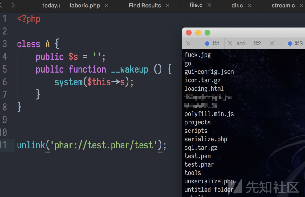 因此可以构造一个特殊的phar包,使得攻击代码能够被反序列化,从而构造一个POP链。这一部分已经太常见了,CTF比赛中都出烂了,没什么值得继续讨论的。值得关注的是到底为什么file_get_contents能够实现RCE。