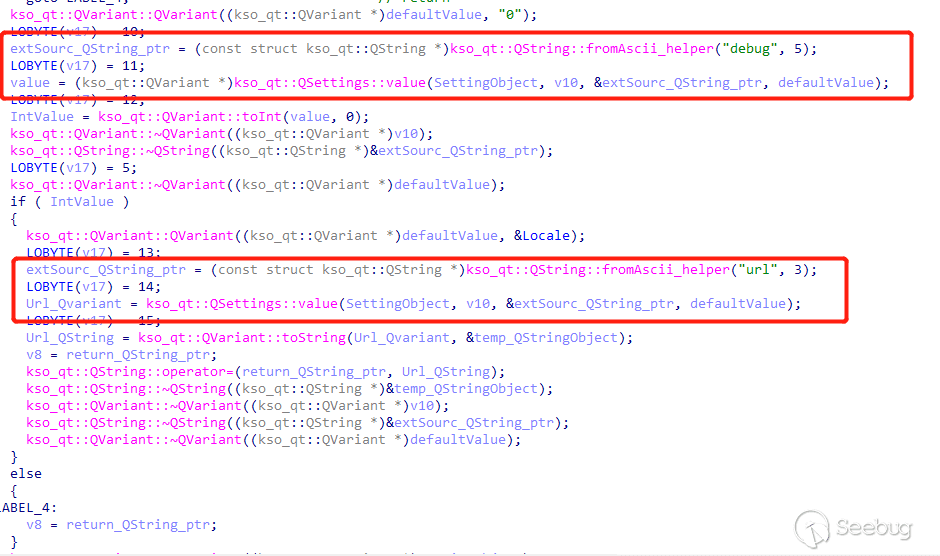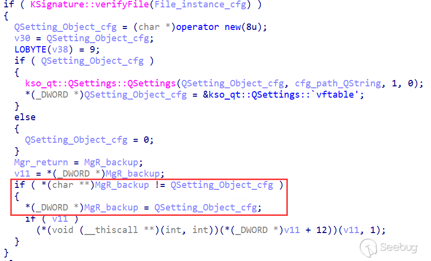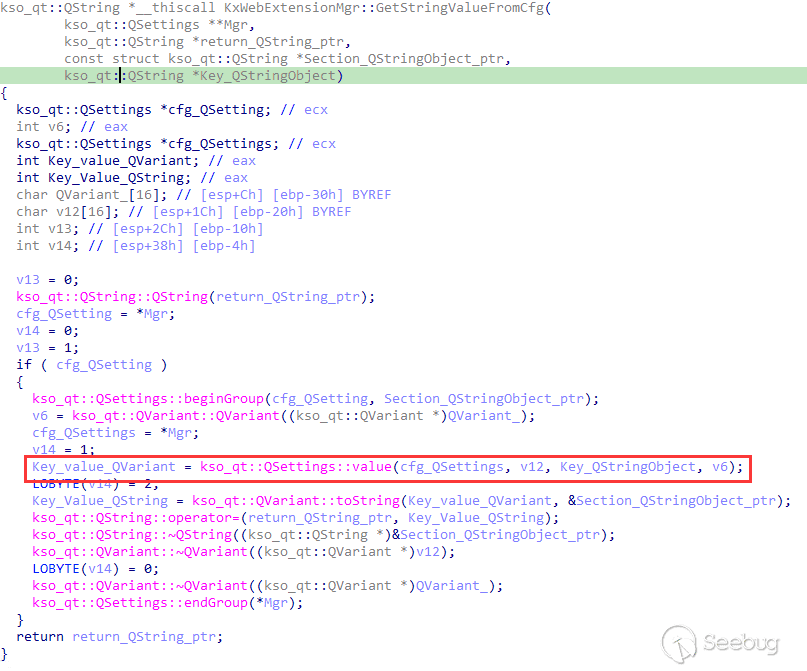 将 cfg 文件以 INI 文件格式储存到 QSetting_Object_cfg,再将 QSetting_Object_cfg 前四个字节赋值为 QSettings 类的虚函数表指针,把 WebExtensionMgr 前四个字节赋值为 QSetting_Qbject_cfg 的地址。