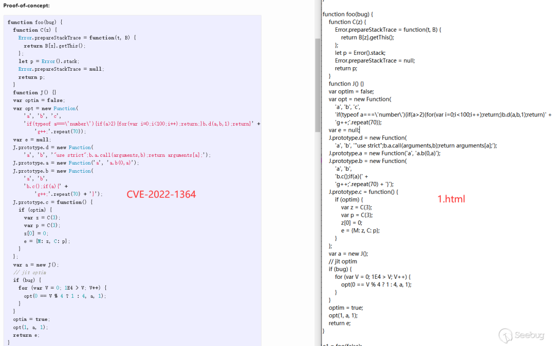 根据访问网页 1.html 的 PoC 核心段代码和 Chrome 漏洞的限定进行查找,可以匹配上该 Chrome 历史漏洞为 CVE-2022-1364。