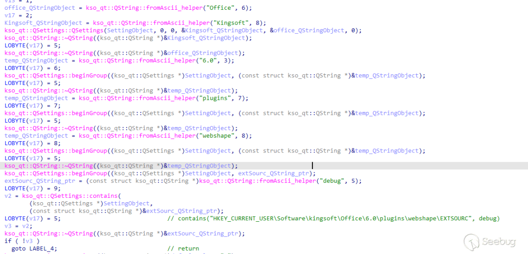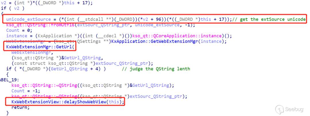 该漏洞触发点在 kso.dll 的 KxWebExtensionView::delayShow