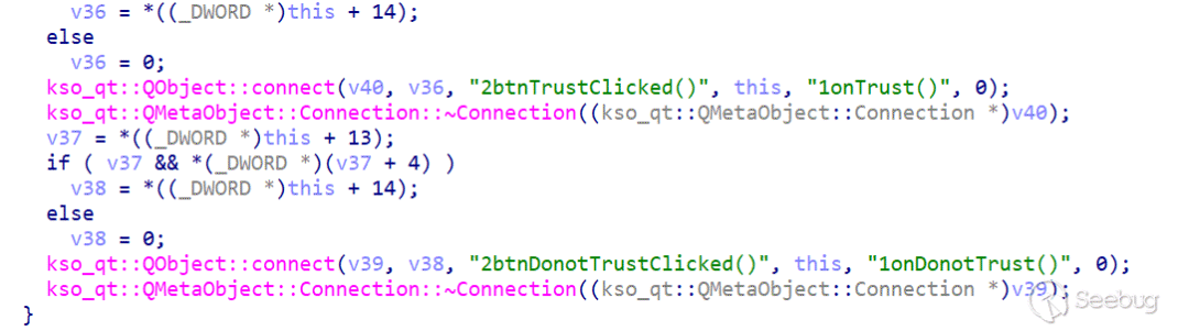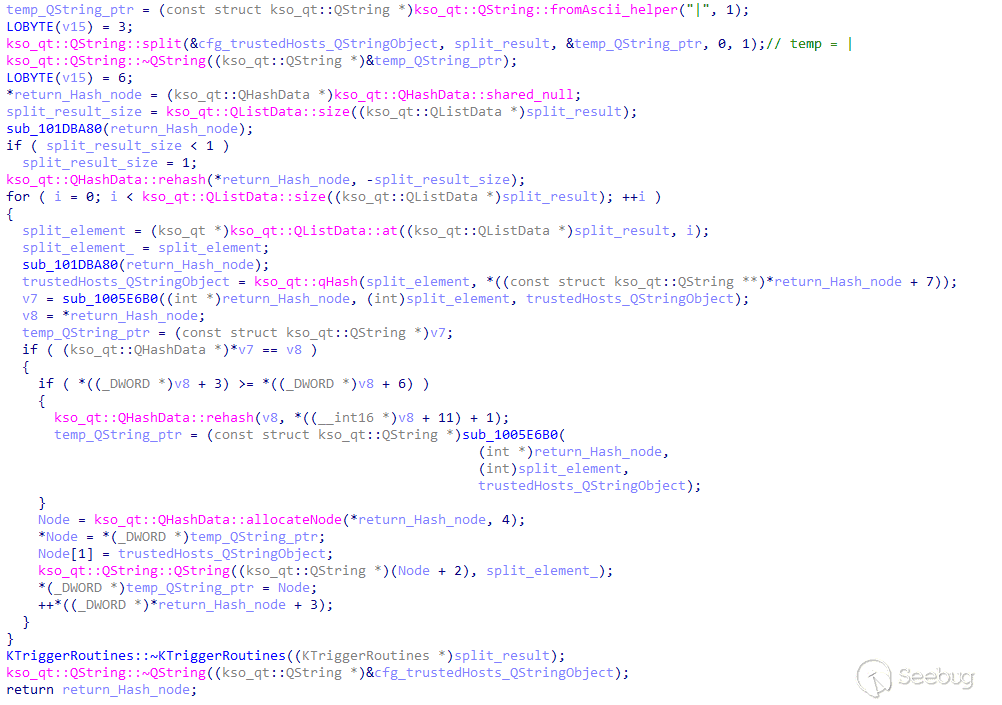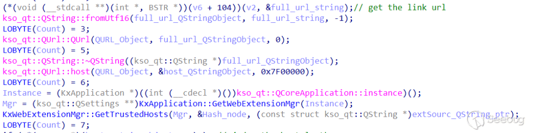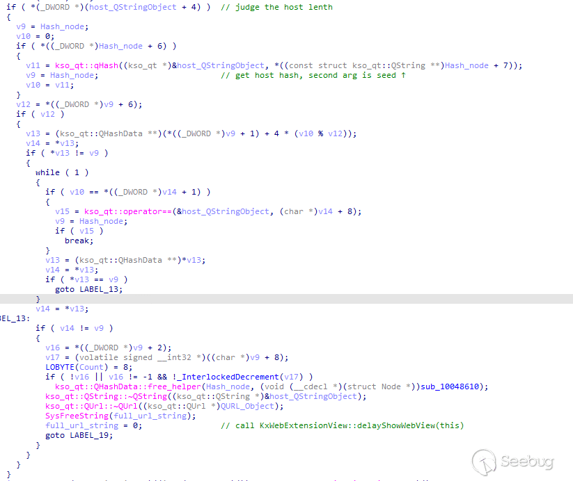调用完 GetTrustedHosts 后,对 host 进行长度判断,通过就利用 GetTrustedHosts 返回的 QHashData 对 host 进行核算,核算通过便放行调用 KxWebExtensionView::delayShowWebView(this)