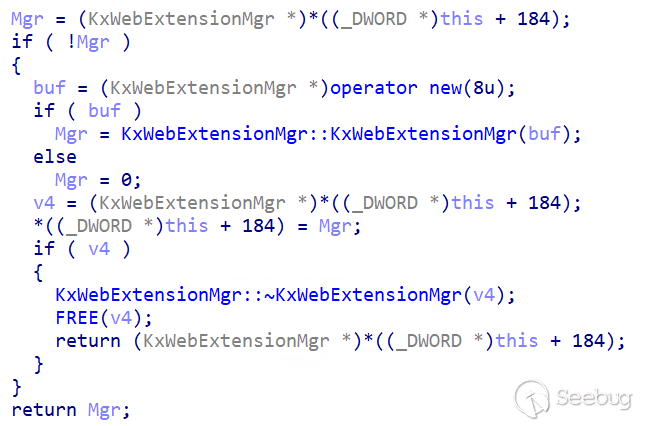 可见 WebExtensionMgr 是一个指向八字节空间的指针,进一步分析 KxWebExtensionMgr::KxWebExtensionMgr
