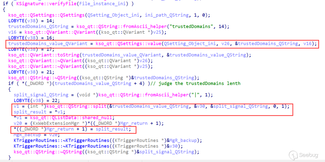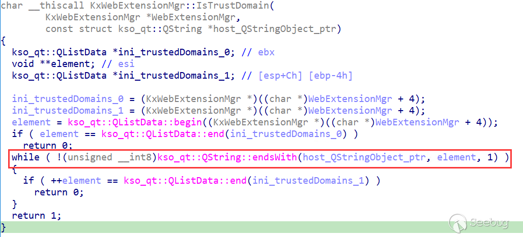 在函数 IsTrustDomain 中,利用 WebExtensionMgr 提取 ini_trustedDomains 字符串,判断 host 是否以 ini_trustedDomains 中的字符串结尾。