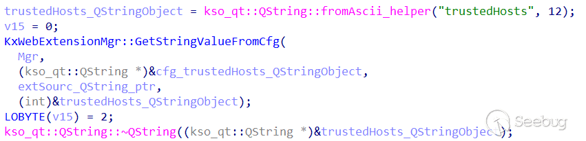在 GetTrustedHosts 中首先调用了 GetStringValueFromCfg 函数获取配置项。根据上面对 GetStringValueFromCfg 的分析可知此处会在 cfg 中寻找 EXTSOURCE