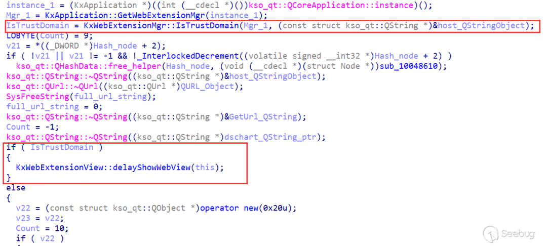 如果未能通过核算,调用 IsTrustDomain 进行字符串匹配,通过匹配放行调用 KxWebExtensionView::delayShowWebView(this)