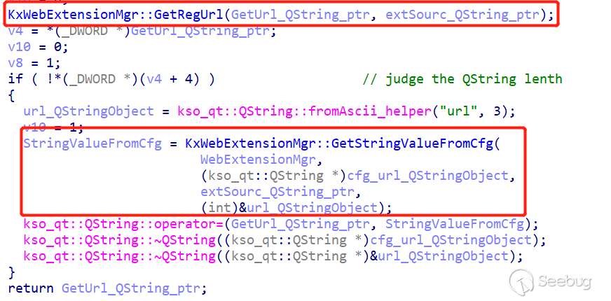 GetRegUrl 返回后长度判断如果为 0,便调用 GetStringValueFromCfg 函数。在 GetStringValueFromCfg 中,先利用 WebExtensionMgr 获取 cfg 的 QSettings 实例,然后在参数指定的节下寻找指定的键,获取键值并返回。