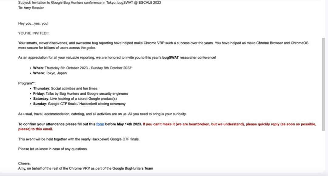 近日,由谷歌举办的BugSWAT 2023大会在东京重磅启幕。本次大会伴随着今年的Hackeler8 CTF决赛开展,邀请了约60位来自全球的安全专家们共同探讨安全洞见和分享前沿技术。受邀专家分别为来自Alphabet旗下各VRP项目的顶级漏洞研究专家,全面覆盖Google、Chromium、Android和Abuse VRP项目。