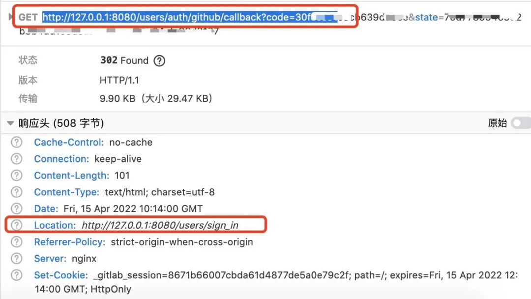 - 最后会向GitHub中填写的Callback跳转 发起GET请求参数为 http://gitlab/users/auth/github/callback?code=xxxxxxx&state=xxxxxxxx,碰到了糟糕的502。但是,有的好消息是、他有code参数和state参数。