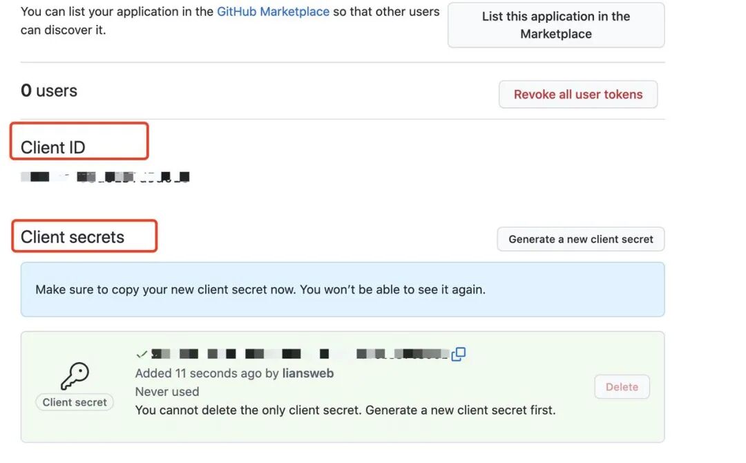 点击Register application注册成功 ,会获取到Client ID 、 Client secrets( 点击 Generate a new client secret 去创建一个新的secret )。