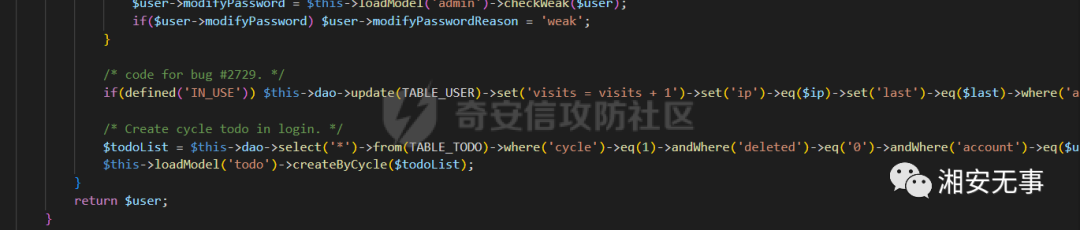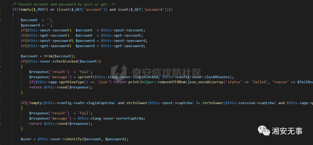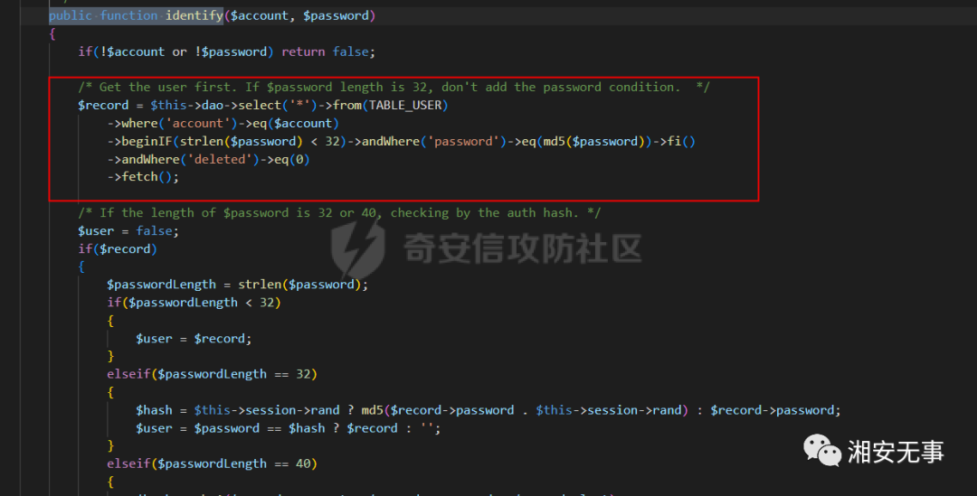 接着往下直接看到identify方法,该方法在同路径下的model.php文件中。看遍了整个方法,涉及到数据库查询的地方都采取了预编译的防御措施,并没有找到能注入的地方。