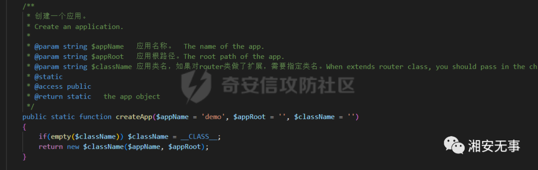 之后就会调用router类中的CreateApp,跟进,定位到/framework/base/router.class.php,根据传入的参数会实例化一个router类对象,,又因为router类继承自baseRouter,所以在实例化router类的时候会调用__construct()魔术方法,也就是父类的构造方法。