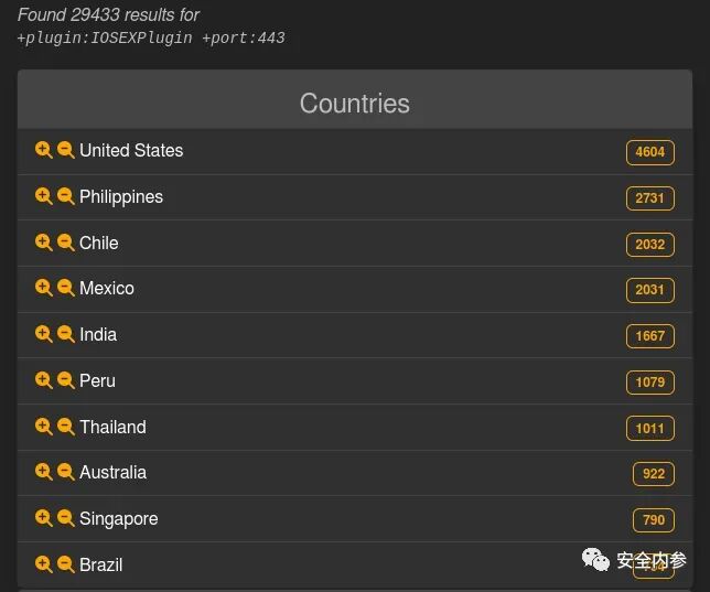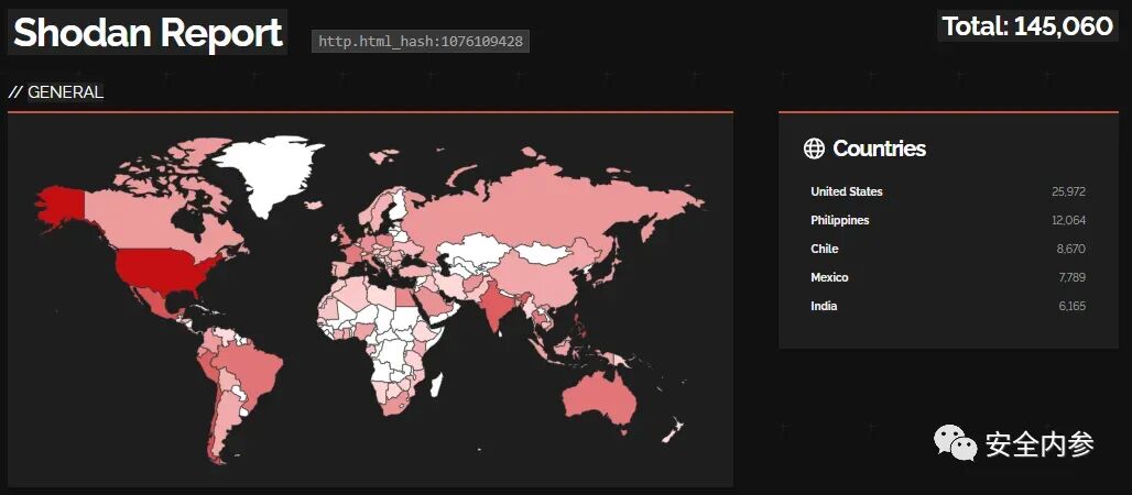 这次搜索使用思科提供的感染指标(IoCs),以确定CVE-2023-20198是否成功感染暴露设备。结果表明,美国、菲律宾和智利等国数千台主机被感染。