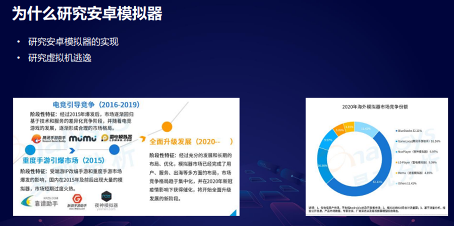 首先讲一下为什么要去研究安卓模拟器。本身我自己也经常用安卓模拟器来做一些 Apk的分析以及一些游戏的使用,还有我想通过这个去研究一下模拟器的实现,还有虚拟机逃逸的一些方式。