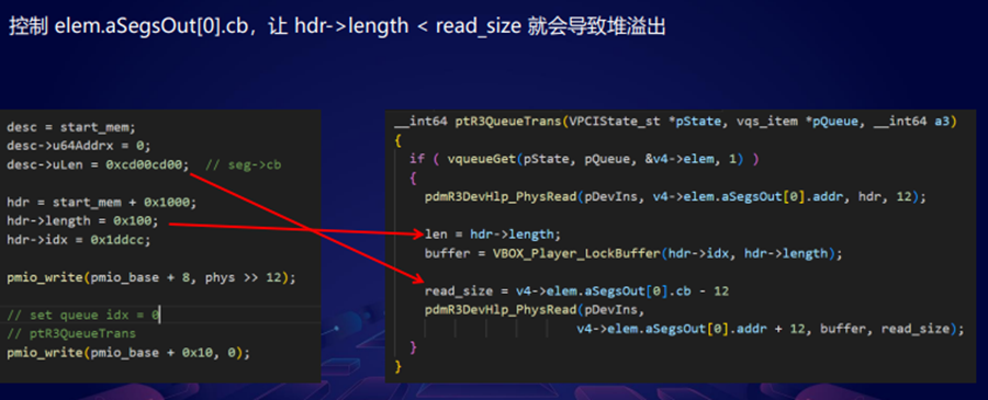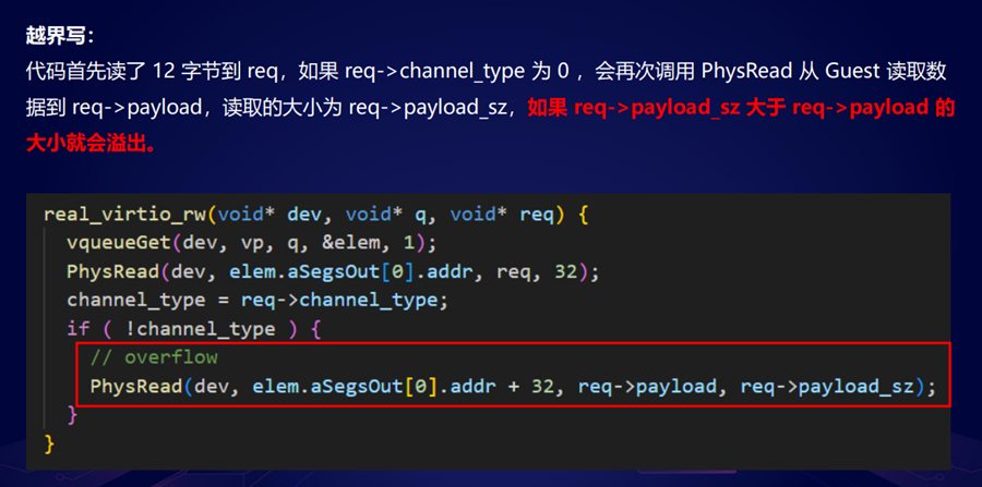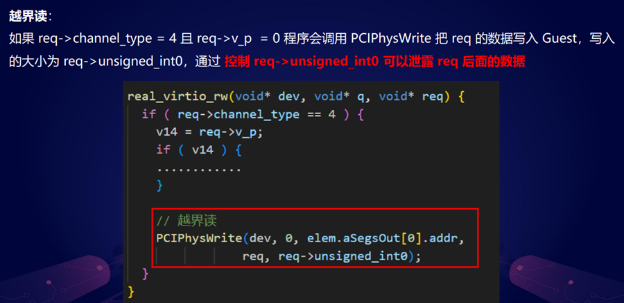 第二行的时候,它会去读一个32字节的req,然后没有检查 req->payload_size,最后调用PhysRead把数据读到 req->payload里面去,