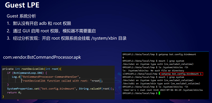 然后进入厂商D,经过尝试发现开启和关闭 root 权限,虚拟机不需要重启,猜想想它应该内部有些进程会再去处理GUI请求。然后我在日志里面搜一下字符串,发现了左边这一块代码,它好像是在设置 root 相关的属性,我尝试去把属性给设成 1 ,发现系统会挂载 /system/xbin/su,通过执行 su 可以拿到 ROOT 权限。