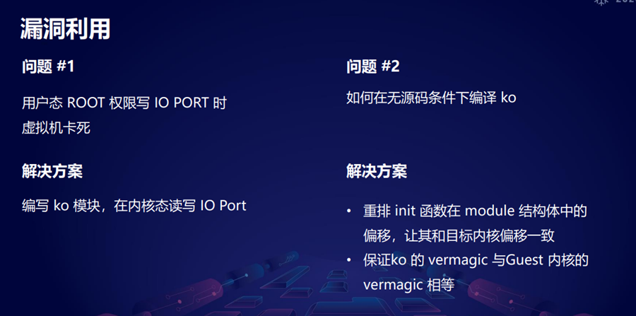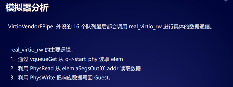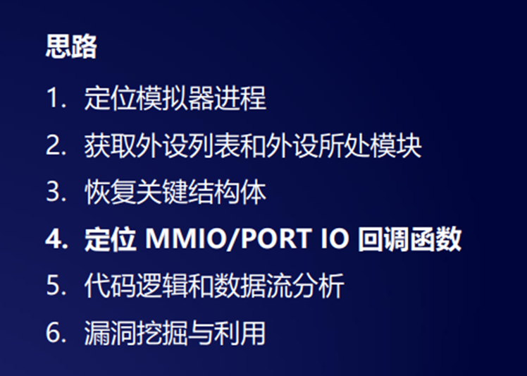 我们定位进程之后,我们要定位到它这个设备起来之后,它到底有哪些外设是加载进来给 guest用的,之后我们需要去恢复一些关键的结构体,再去定位这种ml以及破了io这种 guess的测和后侧的交互的函数,用来做攻击的一些入口。