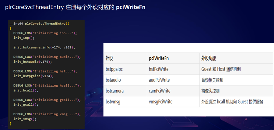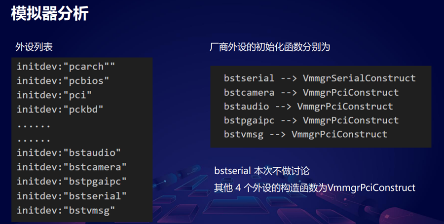 今天我们主要讲其中4个外设,这4个外设它的构造函数都是 VmmgrPciConstruct,该函数主要就是注册共享内存、MMIO。