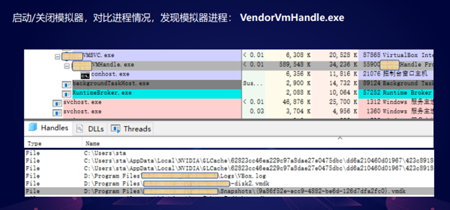 然后我们通过反复的开启和关闭模拟器进程,去对比进程情况,其实可以找到这么几个进程是和目标模拟器相关的,然后我们再去通过一些调试以及一些字符串的查看的话,其实是可以定位到进程大概是叫做VendorVmHandle.exe。