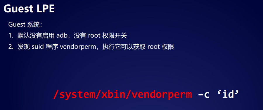 首先我们介绍guess侧提权的 bug。在安卓系统启动之后,他会在5555端口监听一个 adb server,然后我们去连接5555端口就可以获取一个root权限。