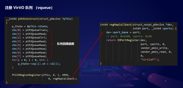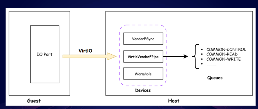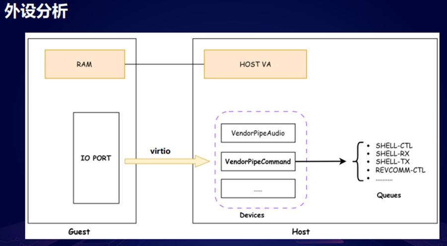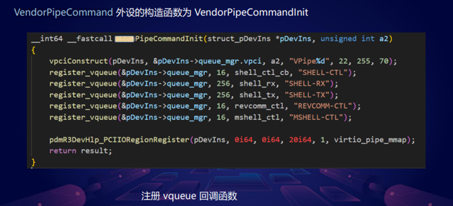 今天我们只看VendorPipeCommand 外设,它会注册一些 virtio队列,Guest 通过写io port 选择回调函数进行通信。