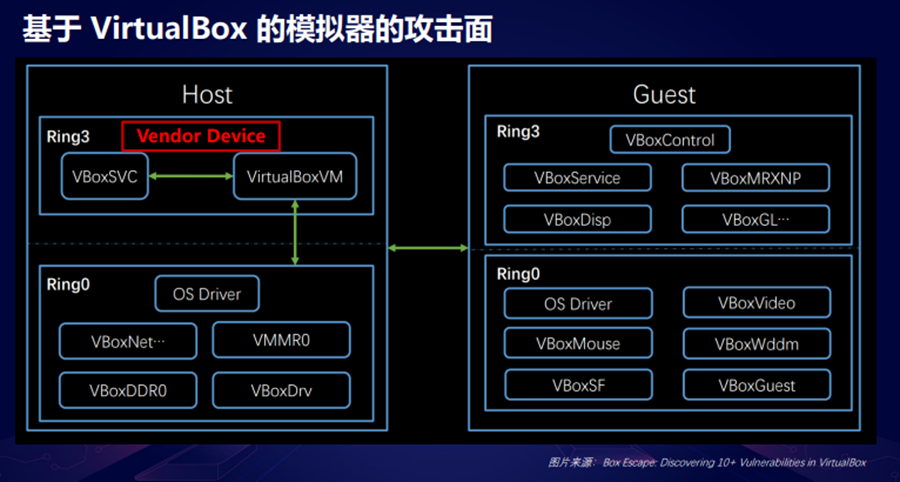 下面这张图其实是之前长亭的一个专家分享过的一个VirtualBox的一些架构图,VirtualBox它在 Guest和host的用户态和内核都会放一些东西来完成这些虚拟化的过程以及它的一些交互。