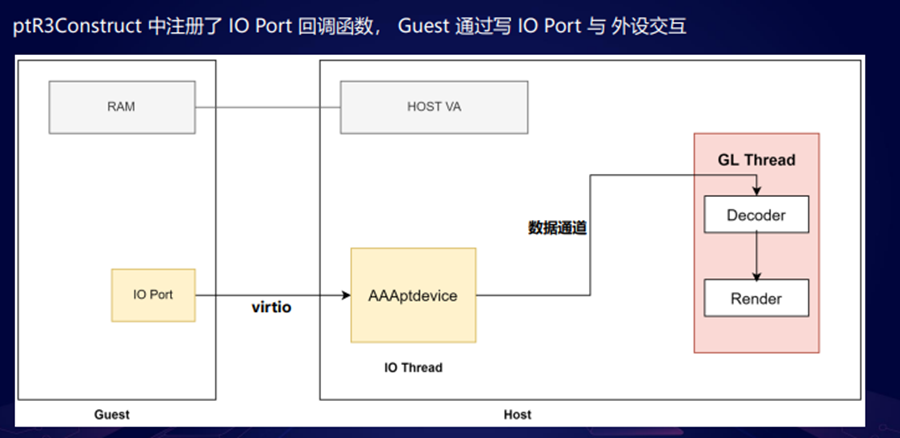 外设的主要逻辑是通过 port io以及共享内存,实现了一个virtio的通信通道,然后这两个guest的侧通过这些通过 virtio 和 GL 线程 进行交互,主要就是guest的侧会把一些图像解析、图像渲染的东西扔给GL 线程 去完成图形的渲染。